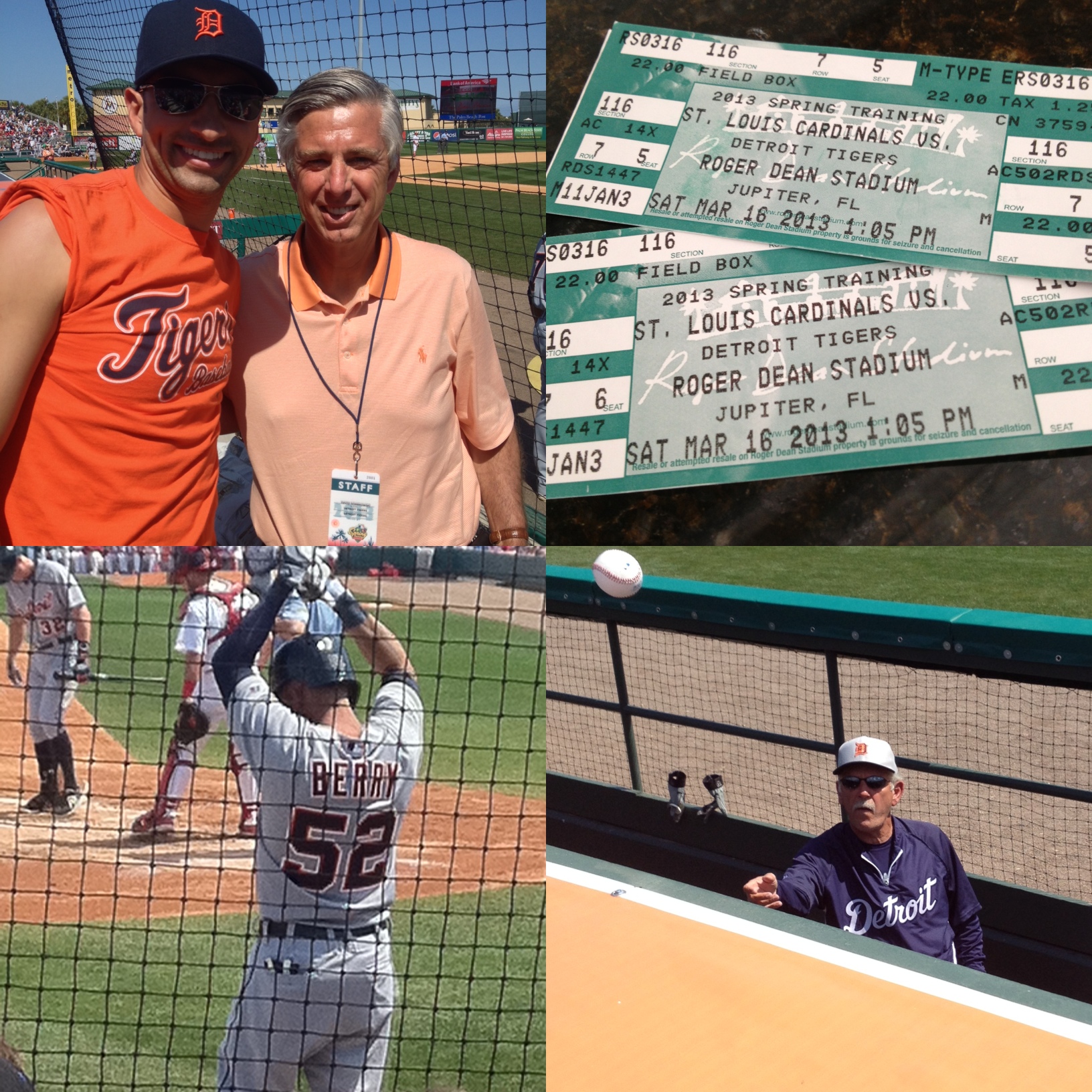 The Detroit Tigers played the St. Louis Cardinals during spring training at Roger Dean Stadium in Jupiter, FL. Motown fans cheered the Tigers to victory with the final score of 3-0. The Tigers management graciously interacted with the fans. General Manager Dave Dombrowski posed with a fan (top left), while Manager Jim Leyland (lower right) autographed a ball for a young fan. The best part was the sunshine and the win.