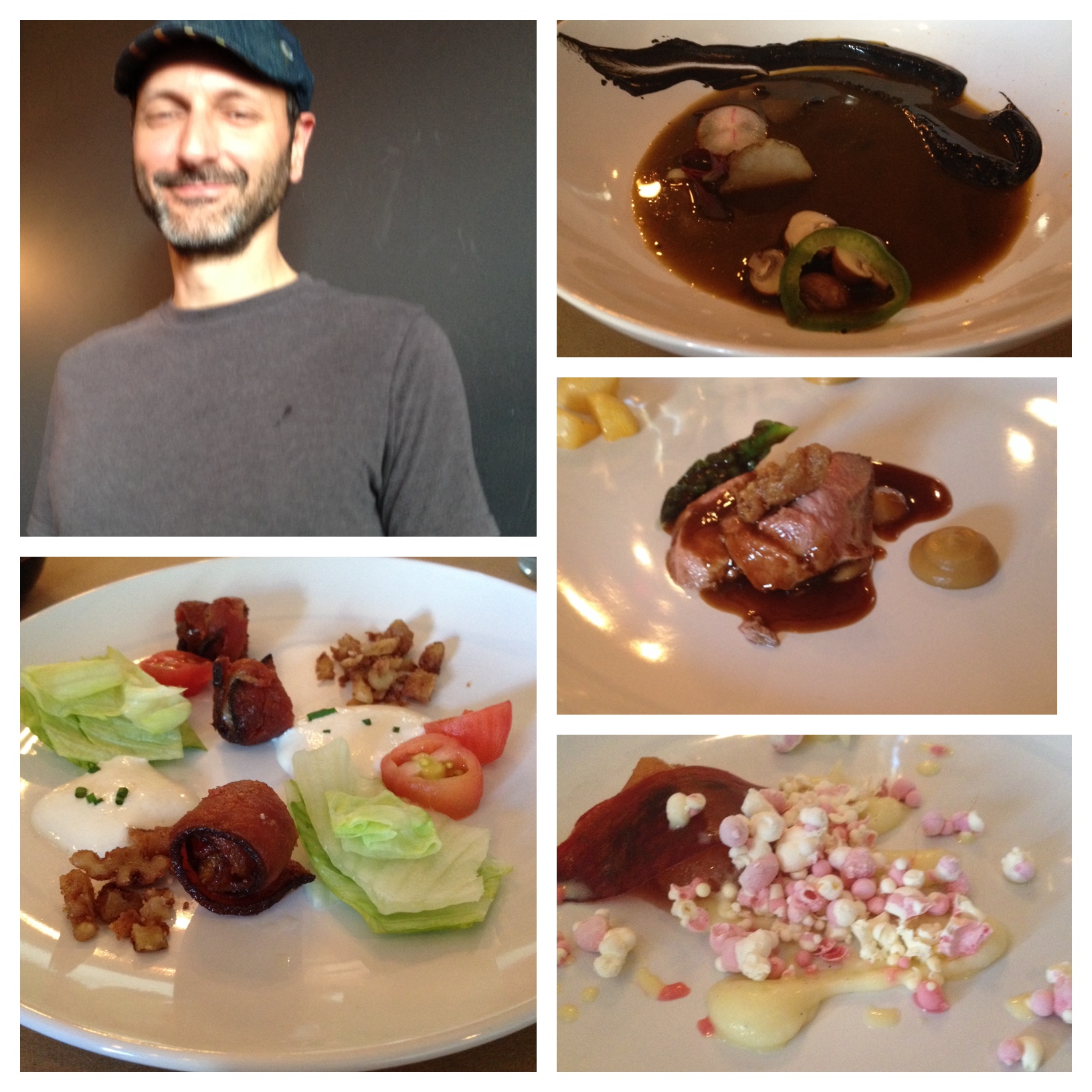 securedownload Revolver is not only a gun in the Motor City. These days it’s a fun restaurant — a revolving restaurant, because the chefs rotate weekly. This unconventional restaurant is located in Hamtramck, Mich., a city surrounded by the City of Detroit. We dined there with Chef Chris Skillingstad. The four-course, prix fixe menu included: Iceberg lettuce, bacon wrapped dates, gorgonzola, candied walnut, grape tomato and aerated dressing; Sunchoke textures, leeks, black garlic, craisin, sweet bell peppers and jalpeno; Duck with blackberry demi-glaze, cocoa, turnip, mushroom, asparagus and yam; Liquid cheesecake, pie crust, pecan, peach, mint and raspberry. The communal dining atmosphere was fun, and the food was delicious. Co-owner Peter Dalinowski (shown) stopped by everyone’s table to describe the concept and greet guests. Chefs all over the country are soliciting Revolver, as they can try out new, unique recipes.