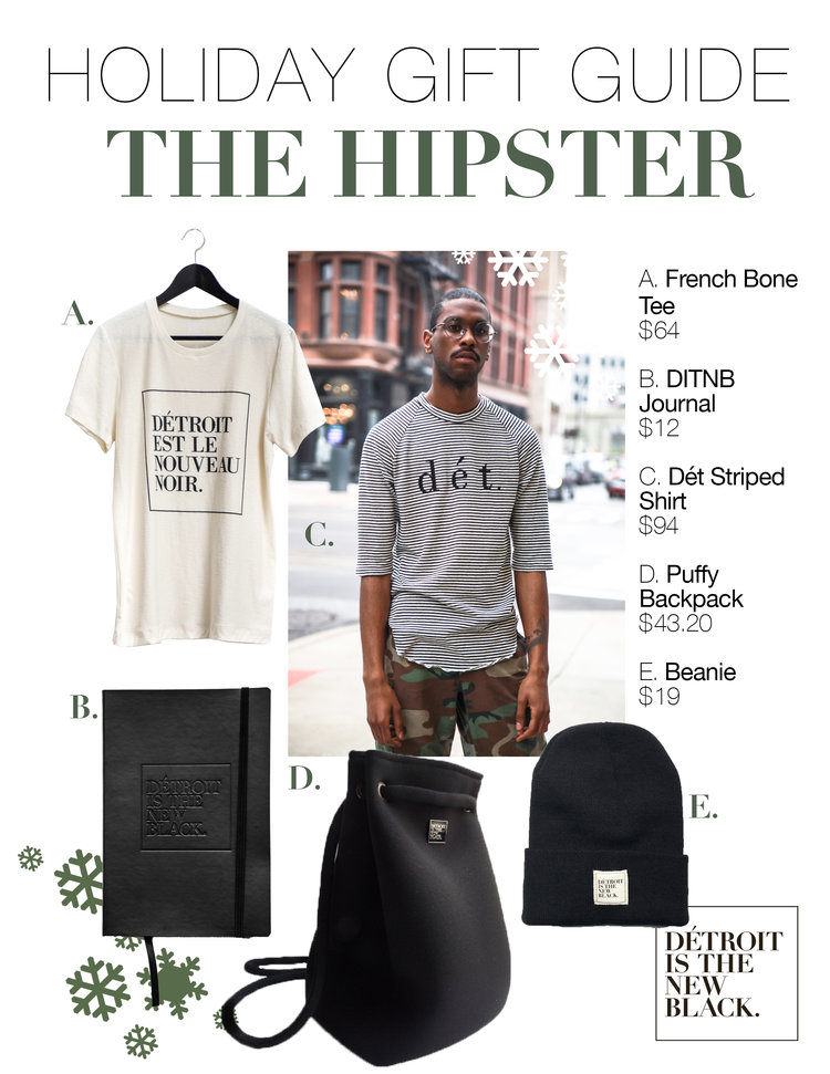 She moved to Detroit in 2013 after spending six years as a retail buyer in New York and Singapore. She coined the phrase Détroit is the New Black and put it on T-shirts. She expanded the line, above, in this holiday hipster guide. In addition she features established designers like Tracy Reese and other labels from the local fashion scene.