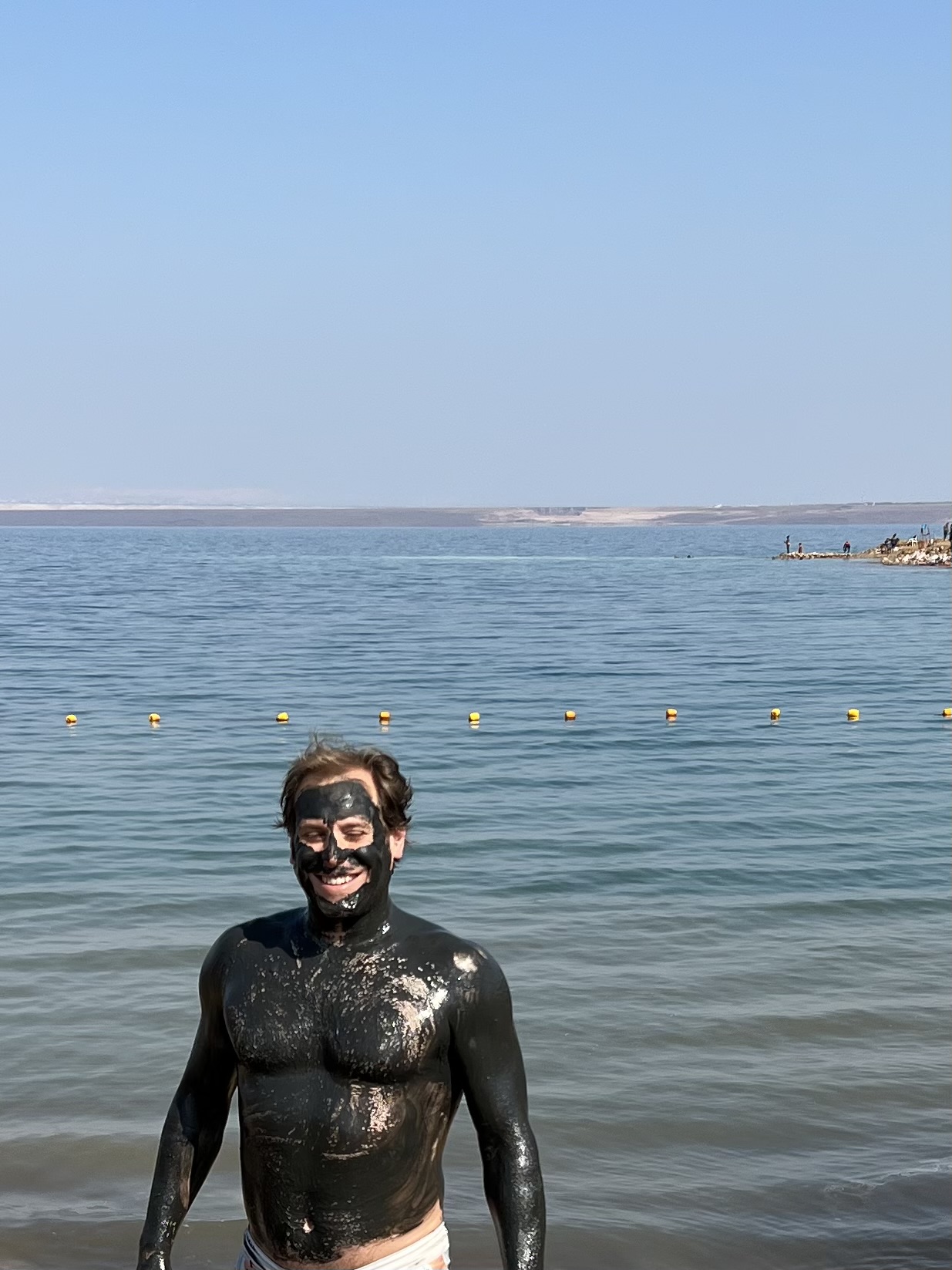 The resort towns in Jordan are luxurious. We stayed in Aqaba with a view of the Red Sea. Then it was off to the Dead Sea, to swim and spa at at a luxury hotel. We treated ourselves to mud baths and sea salts. Please see a photo of my son below. After our spa treatment, my son described us as “glowing.” The photo below does not do it justice as I think we looked washed out!
