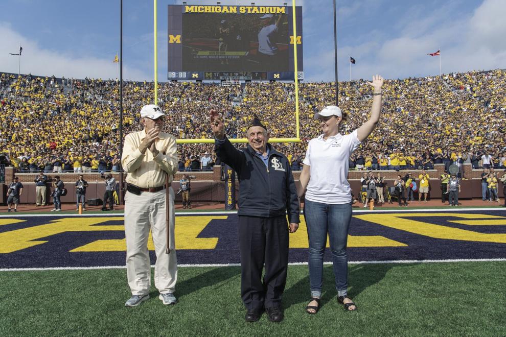 Guy Stern was honored as the “Veteran of the Game,” at the University of Michigan in October, 2018. This photo appeared in the December 21, 2023 edition the Detroit Jewish News. Michigan photography