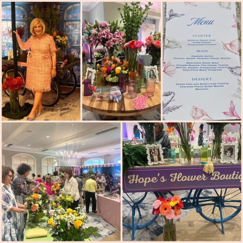 Walking in the room was like walking into the Tuileries Garden in Paris with bursts of color and joy everywhere. Hope’s Flower Boutique cart greeted the eighty some guests. The menu was divine, and the tablecloths and napkins were exquisite. All the guests later took home a vase with a flower arrangement that they created.